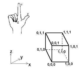 Erweitert man nun die X und Y Achsen um eine weitere Dimension der Z Achse kann man nun Körper im Raum beschreiben. Um die Achsen in den verschiedenen Ansichten zu beherrschen hilft die Rechte Hand Regel.