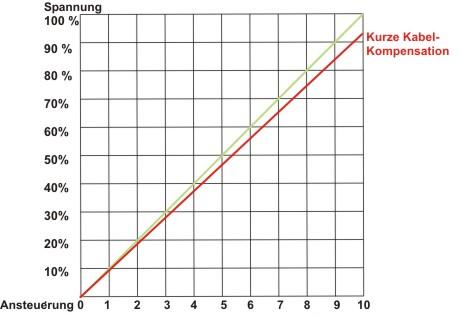 Realisiert wird die Kabelkompensation, indem die Ausgangsspannung der Kreise mit kurzen Leitungswegen nicht einfach limitiert wird, sondern linear über den gesamten Steuerbereich einen proportionalen Faktor zugewiesen bekommt. Im Prinzip stellt dies eine nachgelagerte Dimmerkurve dar. Der Nachteil einer konsequenten Anwendung ist, dass die Kreise nach der längsten Zuleitung, also der schwächsten leuchtenden Einheit ausgerichtet werden muss, da aus der zur Verfügung stehenden Versorgungsspannung nicht ein paar Volt zur Kompensation mit aufaddiert werden kann. Man muss sich im Klaren sein, dass hierbei bewusst auf die nominale Lichtleistung des Leuchtmittels verzichtet wird, insbesondere auch im Hinblick darauf, dass bereits an den Leistungshalbleitern und der Drosselspule bereits einige Volt abfallen.