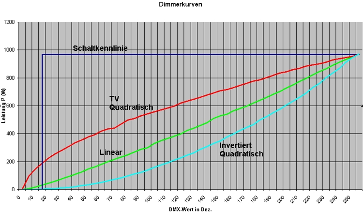 Die Umgekehrte Quadratische Kurve wird dagegen bei Anwendung von Leuchtstofflampen angewendet, da der untere Helligkeitsbereich besonders auffällig im unteren Leistungssektor reagiert und der Regelbereich des Kanalstellers möglichst weit ausgenutzt werden soll.