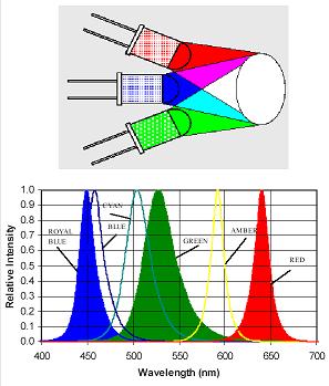 So gibt es weiß abstrahlende LEDs sowie weiß wahrgenommenes Licht aus einem RGB- (Rot, Grün, Blau) Farbmisch-System.
