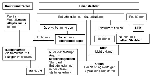 Grundsätzlich kann man Leuchtmittel in zwei Gruppen unterteilen. Da sind zu einem die Festkörper-Leuchtmittel und zum anderen die Leuchtmittel die sich im gasförmigen Aggregatzustand Licht emittieren. Die Festkörpergruppe kann man wiederum in Leitermaterialien wie Kohle oder Wolfram sowie in Halbleitermaterialien basieren, unterteilen. Somit hat man in dem Bereich der Festkörperstrahler die LED sowie die Glühdraht Fraktion. Auf der anderen Seite befinden Leuchtmittel bei denen Stoffe im Gasförmigen Aggregatzustand leuchten. Auch dort lassen sich weitere Unterteilungen durchführen, je nachdem wie das Gas angeregt wird oder welcher Füllstoff unter welchen Betriebsdruck hauptsächlich für die Lichtimmission verantwortlich ist. Dort kann eine Unterscheidung in Plasma, Xenon oder Metallhalogonieden erfolgen. Weitere Quellen wie Natrium oder Niederdruck Quecksilber (Leuchtstofflampe) scheiden grundsätzlich für die Verwendung in Movinglights aus.