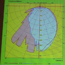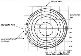 Richtet man den Sensor dagegen auf eine vom Scheinwerfer bestrahlte Fläche, so erhält man die für die Beleuchtungstechnik benötigte Lichtverteilung. In der nebenstehenden Isographenform ist eine Homogenität des Lichtfeldes umfassend wiedergegeben. Eine Lichtverteilungskurve stellt dagegen eine Querschnitt durch die Horizontale Achse dar.