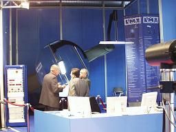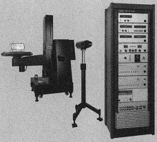 Hier eine Variation mit Spiegel (Hinter den Personen) für größere Leuchten. Der Messensor ist zum Teil rechts am Bild zu erkennen. Die Rechner und Steuereinheit ist links als 19" Schrank aufgebaut. Die Leuchte (Leuchtstofflampe) kann gedreht und geneigt werden. So sind alle räumlichen Ausbreitungen zu quantitativ erfassen.