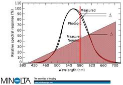 LEDs weisen einen sehr engen Spekralbereich auf. Deshalb sind photometrischen Daten von LED-Scheinwerfern oftmals ohne konkrete Angaben. Das Messen mit einem üblichen Luxmeter, um die Lichtleistung des LED-Scheinwerfers zu beurteilen, ergibt leider abweichende Werte. Denn ein Luxmeter arbeitet mit einer Photozelle, die mit einem optischen Filter ausgestattet ist, der die spektrale Empfindlichkeit des Auges berücksichtigt (V lampta-Kurve), so wie in der Tontechnik z. B. die A-Bewertung. Die Photozelle misst alle eintreffenden Spektralteile und integriert diese zu einem Ergebnis. Historisch ist der Filter für die V lampta-Kurve auf Planck’sche Strahler mit 2850 K, also der Normlichtart A, festgelegt. Dieser strahlt hauptsächlich im Infrarotbereich und fällt zur blauen Farbe hin extrem ab. Die Genauigkeit der Bewertungsfilter bei den Flanken ist deshalb bei Kontinuumstrahlern nicht so entscheidend, da dort die Lichtstärke sowieso gering ist und damit der Messfehler ebenfalls klein ausfällt.