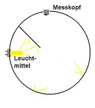 Prinzip: Das Leuchtmittel strahlt in einen Raum, das die Lichtstrahlen diffus reflektiert. Eine direkte Strahlung auf den Meßkopf wird unterbunden. Je nach Meßkopf können unterschiedliche Aussagen getroffen werden.