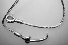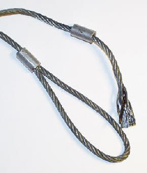Die Pressklemme ist gerissen, die Kausche ist gerissen und / oder das Drahtseil hat sich aus der Klemme herausgezogen. Entweder ist die Last tatsächlich für diese Seile zu hoch, oder aber es liegt möglicherweise eine fehlerhafte Verpressung ( falsches oder ungenaues Press-Werkzeug, "falsch gepresst", o.ä. ) vor. Nach Norm müssten diese Verpressungen 90 % der Mindestbruchkraft der Seile ohne Beschädigung ertragen können, was bei 3 mm - Seilen einer Mindestbruchkraft von ungefähr 450 kg entsprechen würde.