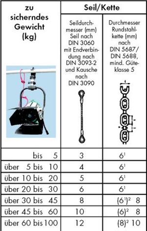 9.11 Sicherungsseil, Die zweite, vom Scheinwerferbügel unabhängige Befestigungsvorrichtung sollte als Sicherungsseil nach DIN VDE 0710 Teil 6 ausgeführt werden.