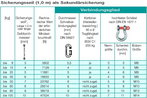Mit der SP 25.1/2-4 (BGI 810-3) liegt ein Werk vor, das Sicherungsseile mit Ihren Verbindungsgliedern umfassend beschreibt. Wie unter Welche Vorschrift ist wie gewichtet zu entnehmen ist, erfolgt die Anwendung der DIN freiwillig zwischen zwei Vertragspartnern. Die VBG verweist auch nicht auf die DIN 56927. Somit ist es nahe liegend, Sicherheitsseile nach der SP 25.1/2-4 auszuführen, da hier bei Anwendung im Schadensfall die Beweislast nicht vom Anwender erbracht werden muss. Die SP 25.1/2-4 ist eine echte Bereicherung, denn Sie unterscheidet zwischen einsträngiger und zweisträngiger Aufhängung, was erheblichen Einfluss auf die Dimensionierung zur Folge hat. Damit sind die Belastungsklassen der Seildurchmesser auch nicht identisch mit den Klassen, die in der DIN definiert wurden. Aber die SP erlaubt verschiedene Verbindungsglieder die praxisbewährt sind wie z.B. Schnellverbindungsglieder nach DIN, aber auch Schnellverbindungsglieder ähnlich DIN, Schäkel, Kettbiner und auch Schraubkarabiner. Jedoch ist nun nach den Erfahrungen die Dimensionierung der Schraubkarabiner stärker beachtet worden, sodass jetzt wesentlich größere Schraubkarabiner zum Einsatz kommen bzw. der übliche Schraubkarabiner erheblich weniger Last sichern darf. Ist bei der Absicherung eines Scheinwerfers am Bügel die Größe des Schraubkarabiners unerheblich, so sind die vorgesehenen Öffnungen für das Sicherungsseil bei Movinglights jedoch für die vorgesehene Dimmensionen der Verbindungsgliedern der entsprechenden Gewichtsklasse oft Schlichtweg zu klein.