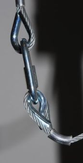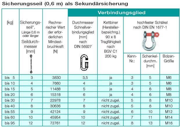 Erster Punkt: Die Norm schreibt eine Mindestlänge der Sicherungsseile von 1 m vor. In der Praxis hat sich bei RTL jedoch eine Seillänge von 80 cm als optimal herauskristallisiert. Zweiter Punkt: In der Norm wird ein Schnellverbindungsglied nach DIN 56926 -