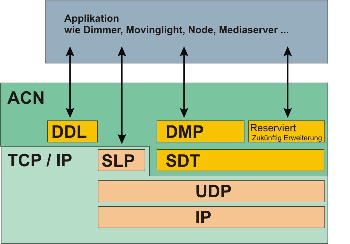 Mit dem ACN Protokoll kann das Netzwerk initialisiert, Konfiguriert und gesteuert werden. Bestimmte Typen von Lichttechnikdaten sind bereits im Protokoll standardisiert worden und können adressiert geroutet werden.