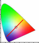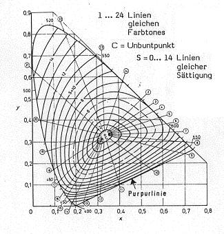 Die Sättigung gibt an wie nahe die Farbe an der Spektrallinie ist. Eine Sättigung mit Null entspricht den Farben der Grauleiter, den sogenannten unbunten Farben. Unbunt E im farmetrischen Sinn liegt bei x = y = 0,333. |