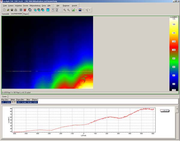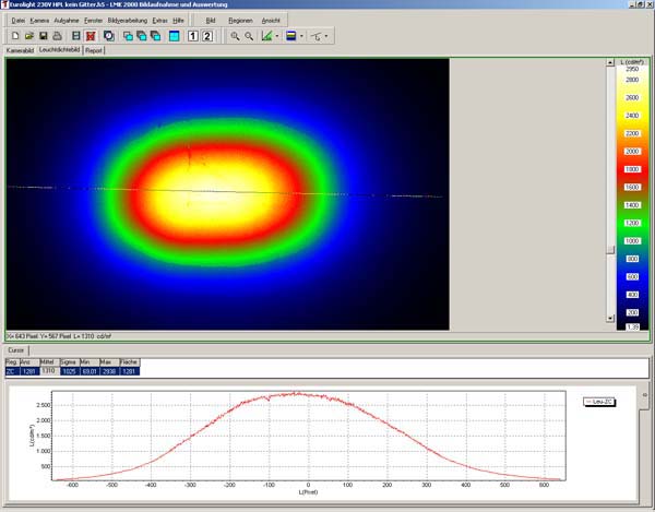 ![]() Lichtverteilungskurve eines Scheinwerfers mit Schutgitterfarbfolienhalterkombination |
