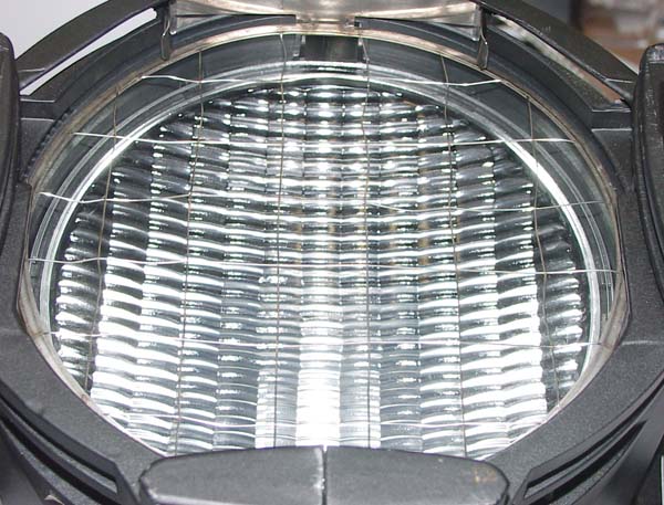 ![]() Strahlengang in einem PAR mit 10 Reihen Linsen auf dem Frontglas. |