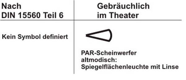 | Die DIN 15560-1 definiert nun diese Gruppe von Scheinwerfer die hauptsächlich über rotationssymetrischer asphärischer Holspiegel vorzuggsweise mit oder ohne Gegenspiegel arbeiten. Während die Din 15560 Teil 6 diesem Scheinwerfertyp nicht als Symbol aufführt, was die Studiolastigkeit dieser DIN erkennen lässt, haben sich dennoch folgendes Symbol herausgebildet. | |