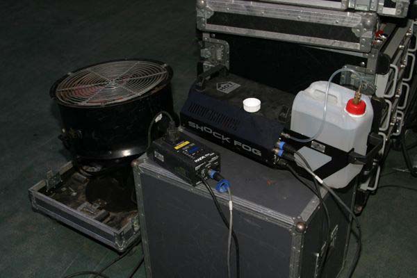 ![]() Das Handtuch verhindert das "zusuppen" des Lüfters mit kondensierenden Nebelfluied. Hier wird nicht nur die Nebelmaschine per DMX ferngesteuert, sondern auch über einen Dimmer der Lüfter. |