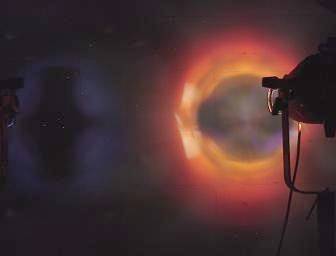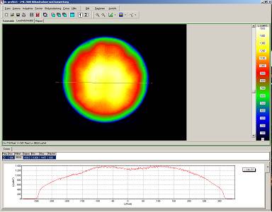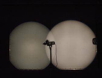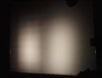 Es ist eine weitgehend gleichmäßige Ausleuchtung zu erkennen. Selbst in den Randbereich hinein wird versucht, die Lichtstärke konstant zu halten, was sehr wichtig für die Goboprojektion (siehe vorher) sowie für einen nahtlosen Übergang von einem Scheinwerfer zum nächsten ist.