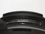 Die Fixierung zum Ausrichten des Gobos erfolgt beim ETC formschlüssig auf breiter Fläche, so dass im Dauerbetrieb, wie hier bei dem Gerät aus dem Verleih, keine große Abnutzung erkennbar ist und das Einstellen leicht von der Hand geht. Beim Eurolite dagegen stimmt die Passgenauigkeit nicht und die Schraube schneidet in den Rand, wie hier am Neugerät deutlich zu erkennen ist. Ein Ausrichten wird somit sehr mühsam und führt zu einem extremen Verschleiß. |