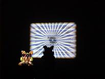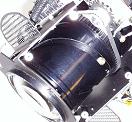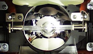 Iris ausgeführt ist, entsprechend einem Fotoaparat die Blende. Bemerkenswert ist hier im Hintergraund ein Defusor zu erkennen. Er wird benötigt um die Probleme der eingesetzten Elipsenspiegel-Konstruktion in Bezug auf Projektionsgleichmäßigkeit zu verbessern. Beim Abdimmen ist aber die Struktur des Defusors als Lichtbild zu erkennen. |