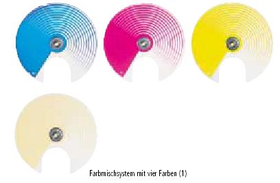 Durch verdrehen der Scheiben werden die Farbkeile immmer enger oder offener, so dass eine Farbabstufung erfolgen kann |