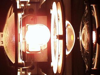 stahlt das gesammte Licht durch die Kondensoroptik. Damit sind die Projektionseigenschaften optimal, da die Lichtstrahlen die eine optische Abbildungsebene gleichmäßig durchfluten sollen einer Richtung die Ebene durchstrahlen. Der Kuglspiegel wirft die nach hinten Abgestrahlen Lichtquanten auf den Ursprung zurück. Mann gewinnt beim Kugelspiegel nur 25%. Hauch weil auf den Linsen durch Reflektionen Licht verloren geht, ist der Wirkungsgrad der Kondensoroptik dem Elipsenspiegelsystem unterlegen. Problematisch ist auch die Temperatur der Kondensorlinse in der Nähe des Leuchtmittels. |