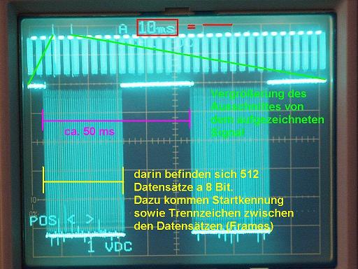 | Man hat die Zeitbasis weiter verkürzt auf 10 ms pro Division. Außerdem ist oben ein zehnfach komprimiertes Signal zu sehen. Dies ist das gesamte aufgenommene Signal aus dem wir eine Position zur Vergrößerung uns anzeigen lassen. Nun ist die Refreshrate zwischen den Paketen nur noch 50ms. Nimmt man nun von den Sekunden den Kehrwert, erhält man die Frequenz, 20 Herz. Folglich passt sich das Interface den Erfordernissen an. Dabei sei bemerkt, daß das menschliche Auge ein Flimmern von 25 Hz bis 30 Hz gerade noch wahrnehmen kann, folglich ist das DMX in der Lage ein gewolltes Flimmern zu ermöglichen. Dies wirkt sich zwar nicht bei Kontiumstrahlern aus, aber kann bei LED´s durchaus beobachtet werden. | |