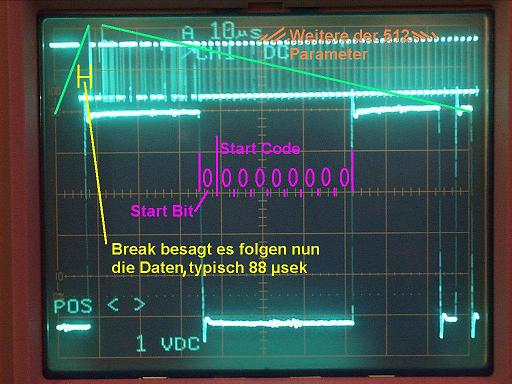 Channel. Im Ruhezustand sendet hier ein Microcontroller Datenpakte fast alle 250 ms aus. Dies ist die Zeit die vergeht von Anfang des ersten Datenpaketes bis zum Anfang des zweiten Datenpaketes. Steht "A 50ms" und "1 VDC", bedeutet das, daß pro Zentimeterkästen nach oben eine Spannungsdifferenz von 1 Volt überbrückt werden muß. Das DC steht für Gleichspannung. A Steht für Kanal A des Osziloskopen und 50 ms ist die Zeitspanne in X Richtung zwischen zwei Linien oder hier für einen Zentimeter. Wenn das Pult keine neuen Werte an die Lampen senden will, so wird es aber in der Praxis dennoch Datenpakete absenden, damit ein Empfänger nicht auf die Idee kommt einen DMX-Fehler zu erkennen. Wenn man dagegen eine Überblendung fährt, dann versucht das Pult möglichst schnell neue Daten dem Empfänger zur Verfügung zu stellen, wie wir es auf dem nächsten Bild (Bild 2) sehen können. |