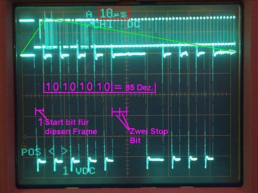 | Um das digitale Protokoll zu veranschaulichen, kann man es meßtechnisch mit Hilfe eines Oszilloskop sichtbar machen. |