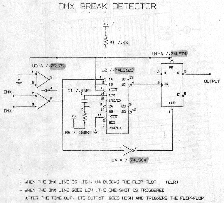 | Triggerimpulsgenerator Oftmals liegt die Schwierigkeit das DMX Signal definiert zu triggern, so das eine Auswertung erfolgen kann. Wenn das Osziloskop keine ausreichende Triggerfunktionen hat, kann man sich mit folgender Schaltung behelfen, die für den Externen Triggereingang eines Osziloskopen, aus dem DMX Signal ein Triggerimpuls generiert. |