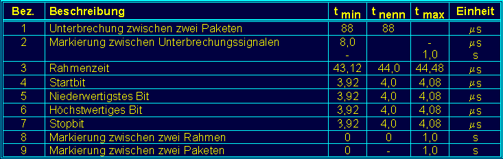 250 kBaud (= 250.000 Bit pro Sek.) Kabellänge ca. 600 m (theoretisch 1200 m) Maximal 32 Verbraucher Steckverbinder 5 pol XLR, Switchcraft, itt Cannon, Neutrix Leitungsabschluß mit 120 Ohm Minimale Zykluszeit für 512 Werte: 22,67 ms |