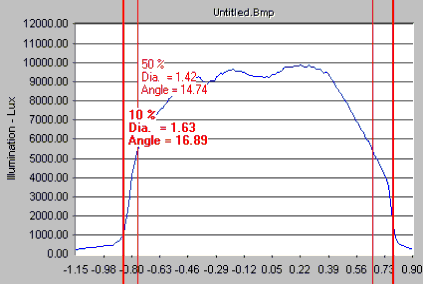 Bei einem Scheinwerfer mit weichen Rand ist r max der Abstand vom Zentrum bis zu dem Meßpunkt bei dem 10% der maximalen Beleuchtungsstärke gemessen werden (der 1/10 tel. Grad Winkel). Diesen Halbmesser unterteilt