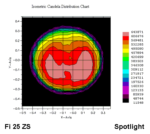 | Unser Auge kann keine Helligkeit oder Farbe als Größe erfassen. Unser Gehirn rechnet Farben und Helligkeitswerte je nach Umgebung und körperlicher Verfassung in dem vom Ihm wahrgenommenen eigenem subjektiven Erscheinungsbild um. Z.B. eine höhere Farbtemperatur wird als hellerer Lichtschein empfunden. Wir können nur direkte Vergleiche sehen und müssen über Messungen oder Datenblättern beurteilen. Dabei brilliert ein Scheinwerfer mit sehr hohen axialen Werten die er durch eine Hotspot Einstellung erreicht, Nachteilig und verschwiegen bleibt der stark abfallende Randbereich der für eine ordentlichen Goboausleuchtung unablässig ist. Deshalb werden aussagekräftige photometrische Daten benötigt um einen Scheinwerfer richtig bewerten zu können. Im folgenden sehen wir ein Isometrische Darstellung, die Lichtverteilung optimal darstellt. | |