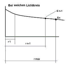 Methode verwendet werden: Unhabhängig von dem Abstand des Scheinwerfers zur Projektionsfläche wird der Halbmesser des Lichtkreises als r (Radius) bezeichnet. Man unterteilt diese Strecke in n gleiche Teile von der Breite r max/n , so da 1-n Zonen entstehen. In den Punkten P0 bis Pn können die Beleuchtungsstärkewerte E0 bis En gemessen und die Beleuchtungsstärkeverteilung grafisch dargestellt werden. |