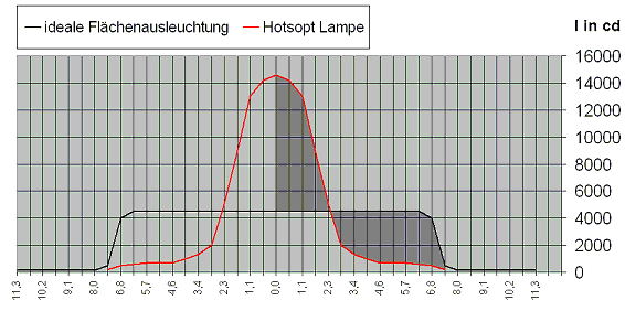 Die Abhängigkeit der Lichtstärke von der Ausstrahlrichtung wird mit der Lichtverteilungskurve (LVK) veranschaulicht. Bei annähernd rotationssymetrischer Lichtstärkeverteilung ist die Angabe der Lichtstärkeverteilung in einer zueinander stehenden Meridianebene durch die Rotationssymetrieachse ausreichend. Bei der Messung der Beleuchtungsstärken werden die Werte zum Eintrag auf der Y-Achse mit dem Quadrat des Abstandes multipliziert, um die Kurve unabhängig der Entfernung zur Meßanordnung darzustellen. Auf der X-Achse wird der Austrittswinkel in Grad aufgetragen. Dabei ist die Mitte das Rotationszentrum der Lichtabstrahlung. Betrachtet man das untere Bild so werden zwei idealisierte Scheinwerfertypen dargestellt. Einmal ein Hotspot und einmal ein Scheinwerfer mit homogener Ausleuchtung. Obwohl die grau dargestellten Flächen in Ihrer Größe identisch sind, ist der Lichtstrom beider Scheinwerfer sehr unterschiedlich. Der Hotspot Typ zeigt zwar einen großen Wert in der axialen Lichtstärke, kann aber nur fiktive 2.246 Lumen aufweisen, während der Homogene Scheinwerfertyp mit mehr als drei mal so kleiner axialen Lichtstärke mit immerhin mit 5.282 Lumen die Bühne erhellt. Wenn es nun darum geht Grundlicht möglichst mit wenig Energieaufwand umzusetzen, so ist der Homogene Typ auf jeden Fall zu bevorzugen. Also sollte man sich nicht auf eine "Flächendiskussion" einlassen, da hier die vorher beschriebenen Gesetzmäßigkeiten greifen. Aber auch ein Hotspot hat seine Berechtigung, wenn man Ihn als weichzeichnenden Verfolger einsetzen möchte, ähnlich einem Niedervolt. Aber für Goboprojektionen ist ein Hotspot lastiger Profilscheinwerfer oder Movinglight denkbar ungeeignet. |