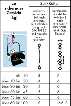 9.11 Sicherungsseil, Die zweite, vom Scheinwerferbügel unabhängige Befestigungsvorrichtung sollte als Sicherungsseil nach DIN VDE 0710 Teil 6 ausgeführt werden.
