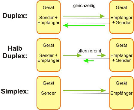 Daten die nur von einem Sender zu einem Empfänger gesendet werden kann man unidirektional nennen, bez. dieser nur in eine Richtung arbeitende Informationssendung (Richtungsbetrieb) wie z.B. der DMX 512 Protokoll, bei dem die Empfänger nur zuhören können aber keine Botschaften zurücksenden können wird auch Simplex-Betrieb genannt. Können die Geräte abwechselnd senden und empfangen, aber nur nacheinander und nicht gleichzeitig, spricht man von Halbduplex- Betrieb (Wechselbetrieb), am besten bekannt bei einfachen Handfunkgeräten, bei der man die Sendetaste drückt und man sprechen kann. Der Gegenüber muss die Lücke abwarten bis die Sendung beendet ist, um zu antworten. Antwortet er währenddessen wird auch die erstgesendete Botschaft unverständlich. Sind die Geräte untereinander gleichberechtigt, das heißt sie können gleichzeitig senden und Empfangen z.B. bei einem Telefon man sprechen und gleichzeitig zuhören kann, spricht man von Duplex-Betrieb (Gegenbetrieb).