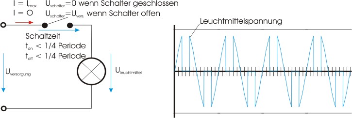 So bleibt letztendlich der Dynamik der schnell heiß werdenden Wendel des Leuchtmittels Tribut zu zollen, indem man innerhalb einer Periode schaltet. Damit weiterhin die Symmetrie der Spannung vom Positiven zum Negativen gewahrt bleibt, wird pro Halbwelle die Spannung geschaltet.