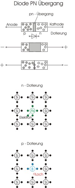 Unter Halbleiter versteht man Stoffe wie Silizium, Selen, Germanium oder Kohlenstoff die vier Valenzelektronen aufweisen und unter thermischer (auch Licht) Anregung Elektronen in das leere Leitungsband abgeben und somit einen Fluss von Elektronen also einen Stromfluss ermöglichen. Die Grundlage eines jeden Halbleiterbauelementes stellt die Diode dar. Deshalb wir sie zunächst einer Betrachtung unterzogen. Die Diode ist ein elektronisches Ventil, das nicht steuerbar ist. Sie läßt den Strom nur in einer Richtung passieren, in der rückwärtigen Richtung "sperrt" die Diode den Strom. Eine Diode besteht aus zwei Schichten. Die eine Schicht wird durch dotiertes Halbleitermaterial erstellt. Dotiert bedeutet, dass man einen Part des z.B. Siliziumkristalls verunreinigt. Man spricht von Donatierung, wenn als Fremdatom ein Stoff ausgewählt und in das Siliziumgefüge eingebracht wird, der ein Elektron mehr als Silizium aufweist. So wird eine N-Schicht gebildet die Elektronen im Überfluss bevorratet, da für die Atombindung nur vier zur Gitterbildung beim Halbleiter genutzt werden. Im Umgekehrten Fall, also die Dotierung mit Fremdatomen mit nur drei Valenzelektronen (Akzeptor) entsteht eine Elektronen Unterversorgung, also Plätze sind nicht gefüllt und somit entsteht dort ein Loch. Man kann hier beim Stromfluss auch von Löcherleitung sprechen die nun als der P-Schicht bezeichnet wird. Trifft nun eine N-Schicht auf eine P-Schicht, so diffundieren freie Elektronen zu den Löchern und eine Rekombination der Ladungsträger tritt ein. Es entsteht ein P-N- Übergang, bei der die freien Ladungsträger verarmt sind und somit nicht leitfähig ist. Dieser Übergang besteht aus zwei Raumladungszonen die ein Potentialgefälle also die Diffusionsspannung, zwischen der N- und der P- Schicht, aufbaut.