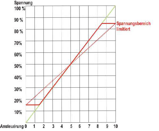 So wie man verschiedene Dimmerkurven realisiert, kann man auch dem Wertebereich der Ansteuerung einen oberen und unteren Grenzwert zuordnen. Das heißt, die maximale Ausgangsspannung wird limitiert aber auch die Mindestspannung kann oft eingestellt werden. Somit können im Notfall z. B. auch 110-V-Leuchtmittel über einen 220-V-Dimmer gesteuert werden, ohne dass die Leistungsgrenze überschritten wird. Inwieweit die Wendelanordnung genügend Abstand untereinander aufweist, um bei der höheren Scheitelspannung noch keinen Überschlag zuzulassen, hängt vom Leuchtmittel ab, funktioniert aber in der Praxis in fast allen Fällen. Damit die Spannungsbereichsgrenzen-Funktion sich auch deutlich von der Dimmerkurvenfunktion abhebt, kann der Regelbereich der Ansteuerung über den gesamten Faderweg extrapoliert sein, wie es im Diagramm mit der gepunkteten Linie dargestellt wird.