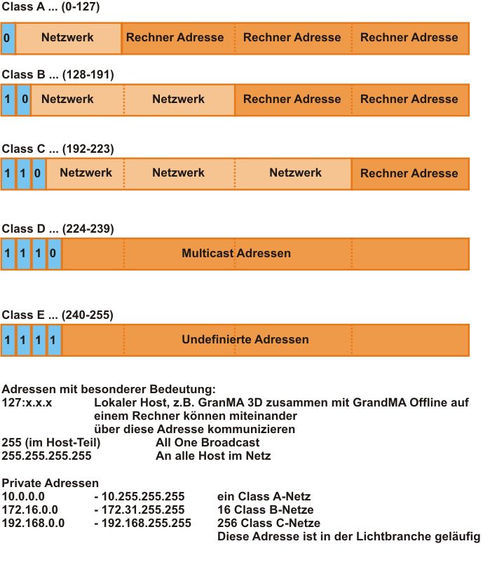 Der Unterschied zur Adressierung der bei Lichtstellanlagen wie z.B. MA Produkten und z.B. ein Home-Netzwerk z.B. unter Windows PC´s ist, daß unter Windows zusätzlich noch die Subnetz Maske 255.255.255.0 eingetragen werden muß. Die Subnet Mask kann aus einem größeren Netzwerk mehrere kleine Unternetze definieren, auf Kosten der Anzahl der Rechner in einem Netz. Außerdem müssen alle Netzwerkrechner den gleichen Arbeitsgruppennamen aufweisen, da ansonsten der andere Rechner nicht erkannt wird. Dies ist bei der z.B. bei einer MA-Configuration nicht nötig.