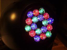 Deutlich zu erkennen sind drei Lichtquellen bei diesem Ayrton Easycolor kopfbewegten Scheinwerfer. Das Licht mischt sich für den Betrachter beim Auftreffen auf den Körper. Die Lichtquelle sowie auch das von Staubpartikeln (Kondensationströpfchen bei Nebeleinsatz) reflektierte Licht wird bei geringen Betrachtungsabstand noch in den Grundfarben differenziert wargenommen.