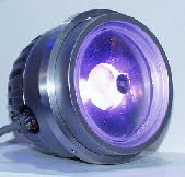 LED-Strahler, bei Strahlern der Firma Xilver ist die Farbmischung innerhalb des Scheinwerfers vollzogen. Das austretende Licht sowie der Blick auf den Lichtaustritt zeigt die gemischte Farbe im Gegensatz zum oben gezeigten LED-Strahler, wo die räumliche Trennung der drei Grundfarben weiterhin ersichtlich bleibt.