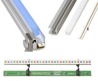 LED-Streifen (Strips) werden einfach aneinandergereiht und können in verschiedenen Profilen Einsatz finden und z. B. Treppenstufen markieren. Die Farbmischung erfolgt durch milchige Kunststoffabschlüsse. Hauptvorteil hierbei ist z.B. bei Treppenstufenprofilen, die "unendliche" Lebensdauer, das besonders das auswechseln der Leuchtmittel in Treppenkanten sehr aufwendig und damit Kostenintensiv ist.