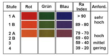 Aus diesem Grund wird der Farbwiedergabeindex verwendet, der angiebt, wie stark eine natürliche Farbe durch die Lichtquelle verfälscht werden kann.