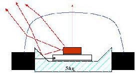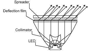 Um einen engen Abstrahlwinkel zu erreichen, werden optische Lichtführungsplastiken aus Acryl dem Leuchtkörper vorgesetzt. Dabei werden wie bei einem Spiegel schräg auftreffende Lichtstrahlen mit einer Totalreflektion an der Grenzfläche des Acrylkörpers, in die gewünschte Lichtaustrittsrichtung geführt. So werden Austrittswinkel von bis zu ca. 10 Grad erreicht.