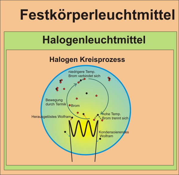 Der Unterschied zur normalen Wolframfadenlampe ist die Zumischung von Hologenen wie Jod oder Brom. Der Halogenzusatz verhindert bei einer Glastemperatur von mehr als 250 °C den Niederschlag von Wolfram auf dem Glaskolben. Denn das Jod reagiert mit den vom Glühdraht verdampften Wolframatomen und geht eine Verbindung ein und verhindert somit den Niederschlag an der Glaswand. Bei hohen Temperaturen zerfällt die Verbindung durch Pyrolyse wieder in ihre Elemente – Wolframatome setzen sich dann bei Kondensation an den kältesten Stellen der Wendel wieder ab. Aufgrund der nicht vorhandenen Kolbenschwärzung kann der Glaskolben einer Halogenlampe sehr kompakt gefertigt werden. Das kleine Volumen ermöglicht einen höheren Betriebsdruck, der wiederum die Abdampfrate des Glühdrahtes vermindert. Daraus ergibt sich der lebensverlängernde Effekt bei Halogenlampen. Jedoch wird der Halogenprozess durch Dimmung der Halogenleuchte vermindert, da die dafür notwendige Temperatur nicht mehr erreicht wird.