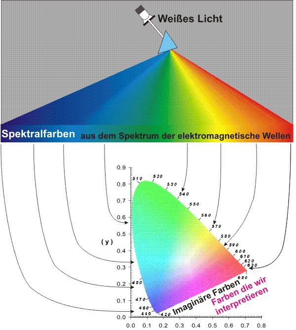Eines von Vielen Modellen, das Farbdreieck - Mischung aus Spektralfarben und den menschlich gesehenen Farben aus empirischen Studien.