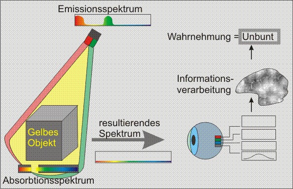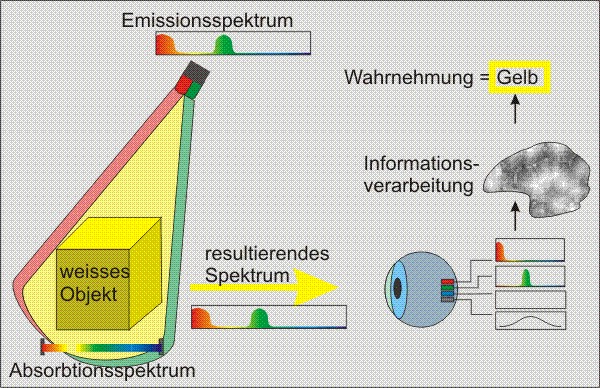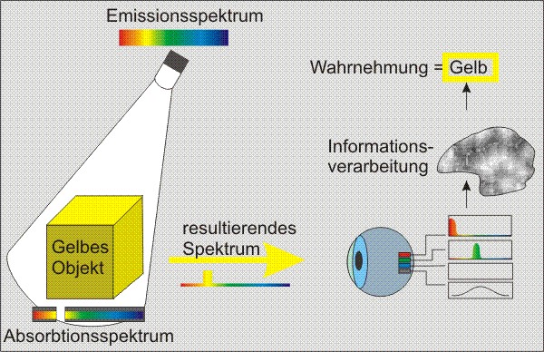 Grundprinzip des farbigen Sehen. Weisses Licht strahlt ein Objekt an, welches mit seinen Farbpigmenten bestimmte Lichtfrequenzen reflektiert und die anderen Frequenzen absorbiert. Unser Auge mit den drei farbigen Rezeptoren und den Hell/Dunkel Rezeptoren leitet die Information weiter durch den Sehnerv. Unser Gehirn interpretiert daraus eine Farbe.