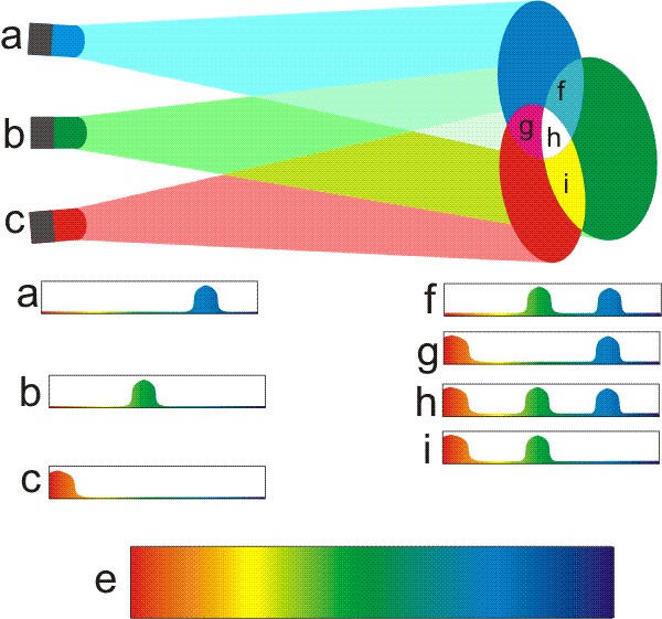 Bei der additiven Farbmischung werden vorzugsweise die Primärfarben rot Grün und Blau zusammen gemischt. Durch die anteiligen Verhältnisse zueinander verändert sich der wahrgenommene Farbton. Das Prinzipbild der additiven Farbmischung macht deutlich, wie bei engen Linienstrahlern, wie es die LED von Natur aus ist, die ein schmales Spektrum aussendet, die resultierende Farbe bestimmte Spektren gar nicht aufweisen.