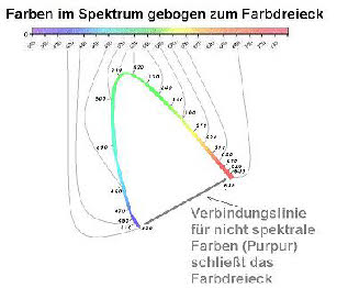 Außerdem findet man oft die Temperaturwerte der plankschen Strahlung in dem Farbdreieck eingezeichnet. Sie entspricht der Farbe entsprechend der Farbtemperatur von Kontiniumstrahleren. Linienstrahler werden zwar auch mit Farbtemperaturen charakteriesiert, liegen aber gestreut von dieser Linie auf Geraden der ähnlichster Farbtemperatur.