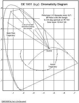 Um die Hufförmigen Spektralfarben des Farbdreieckes linear nacheinander abzubilden, wäre es wünschenswert eine dichroitischen Filterfläche zu haben, die entlang der X-Achse kontinuierlich sich im Spektrum verschiebt. Dieser Filter würde entlang eines sehr enger Lichtstrahls der Scheinwerferoptik verschoben werden und würde somit jede Spektralfarbe darstellen. Dieser Filter stellt, in dem begrenzten Licht durchfluteten Bereich für die gewünschte spektrale Frequenz, ein Bandpass dar.